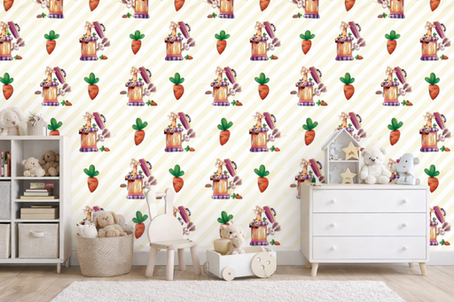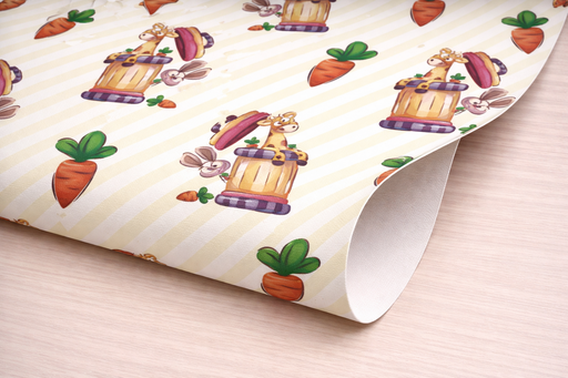 Un estampado de rayas diagonales amarillas y blancas en el que aparecen zanahorias junto con jirafas y conejos escondidos. Opciones de material: ...