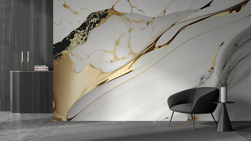 Un mármol con vetas doradas resaltadas sobre un fondo claro, perfecto para decoraciones con un toque de lujo. Opciones de material: Vinilo impres...