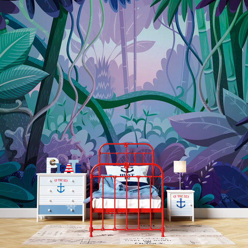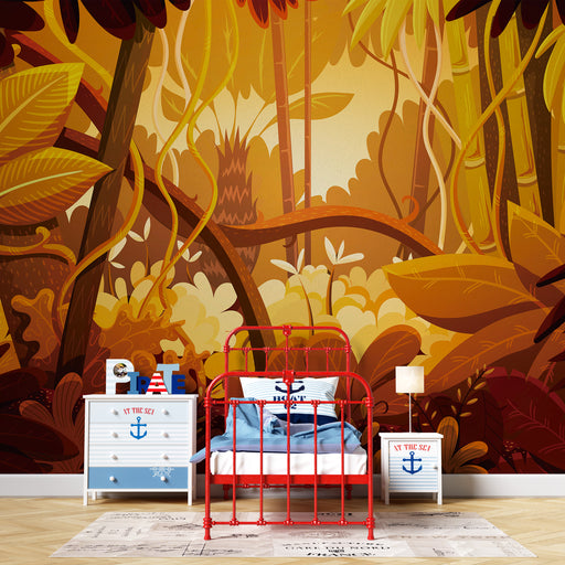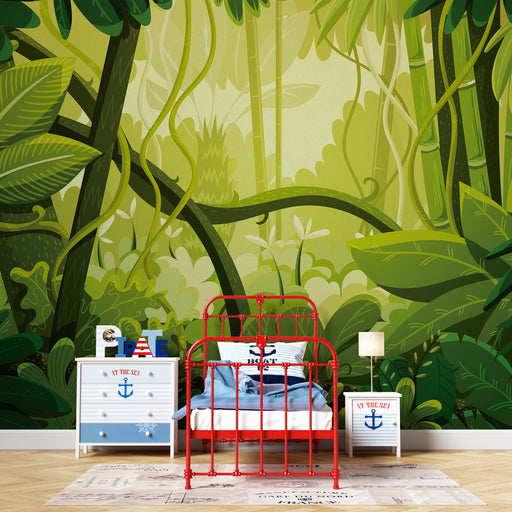 Un paisaje selvático con tonos verdes intensos y vegetación exuberante, perfecto para una habitación aventurera. Opciones de material: Vinilo imp...