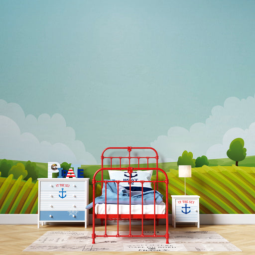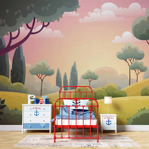 Paisaje con colinas suaves y colores pastel, ideal para un espacio infantil tranquilo y armonioso. Opciones de material: Vinilo impreso para inte...