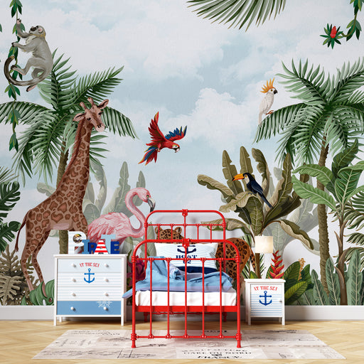 Un paisaje tropical con jirafas y palmeras, perfecto para una habitación con temática de naturaleza. Opciones de material: Vinilo impreso para in...