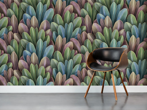 Un patrón de hojas dispuestas en formas geométricas naturales. Opciones de material: Vinilo impreso para interiores: Fácil de limpiar y mantener....