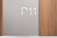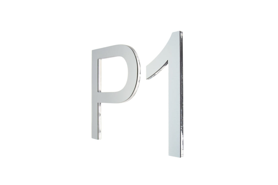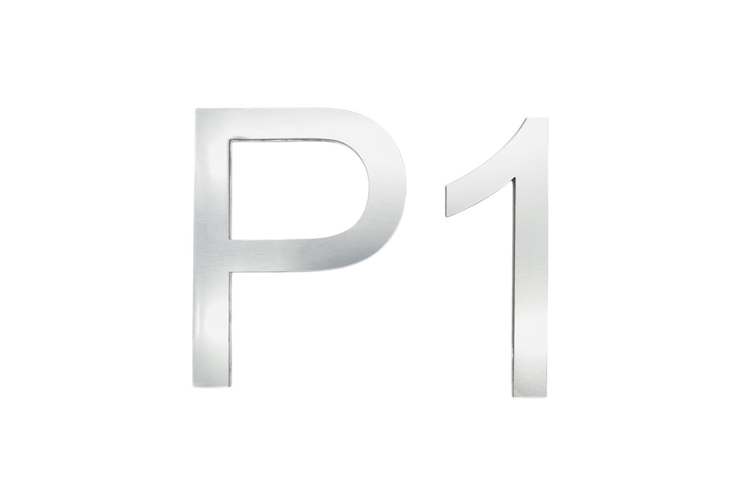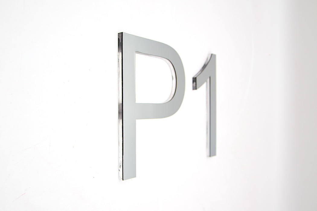 Letra P y numeración con frontal bicapa dorado y trasera de metacrilato de 5 mm. Elegantes, resistentes y personalizables para señalización.