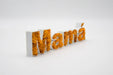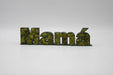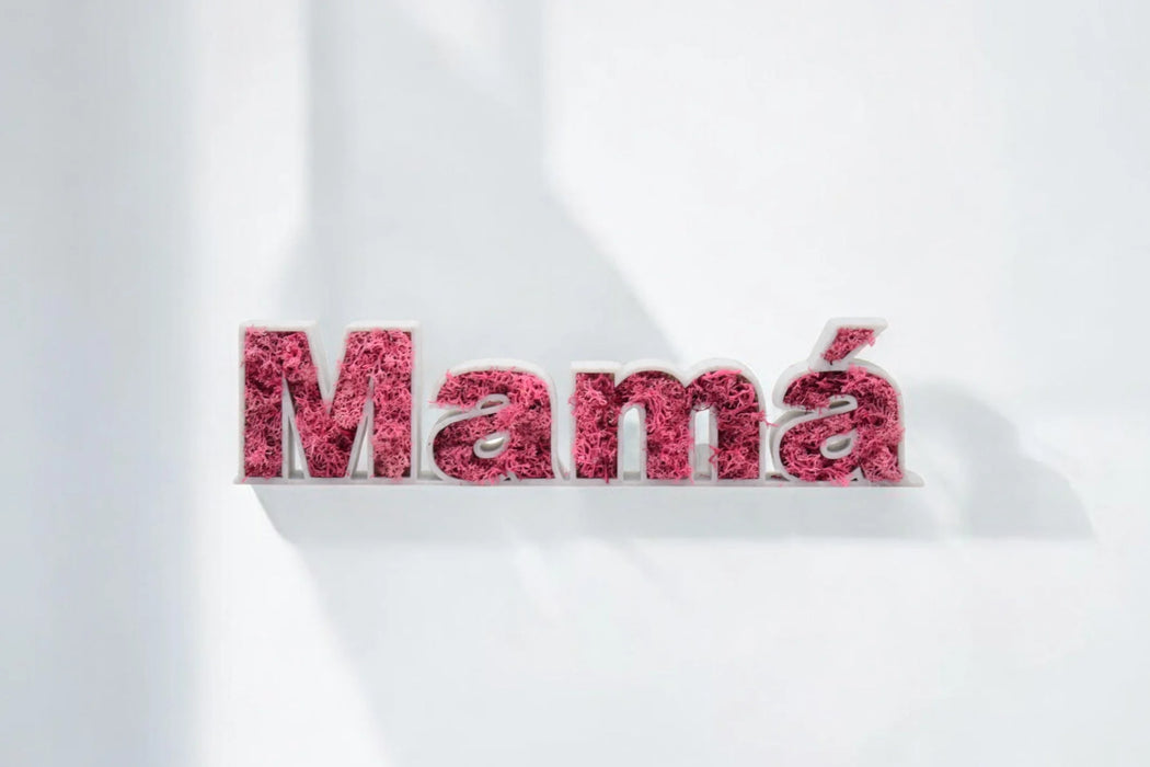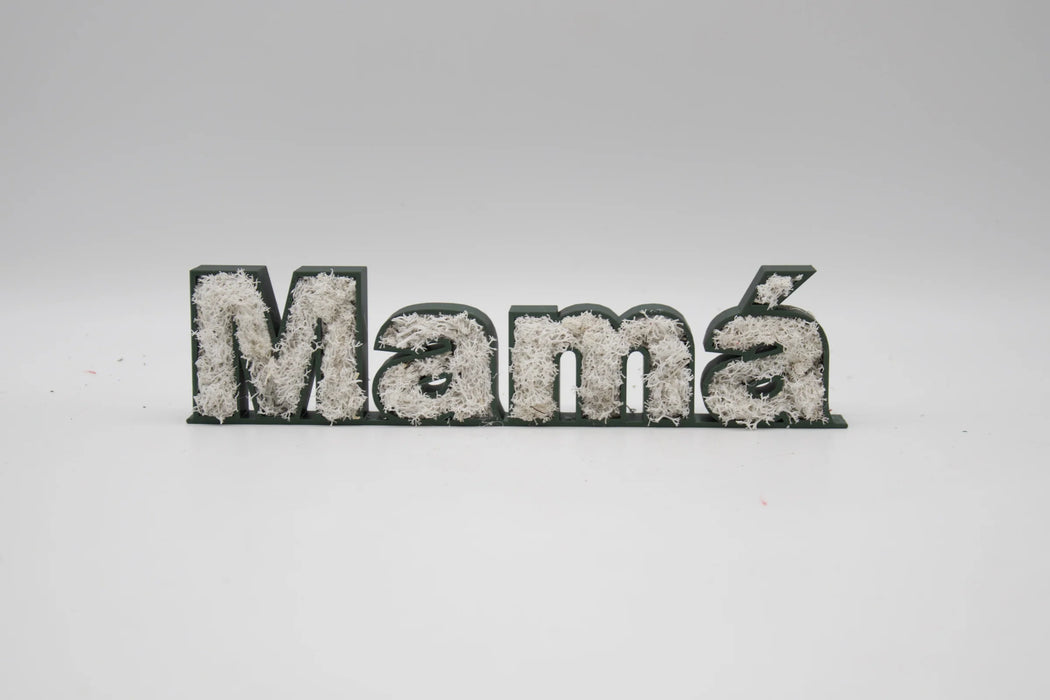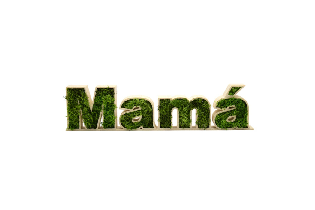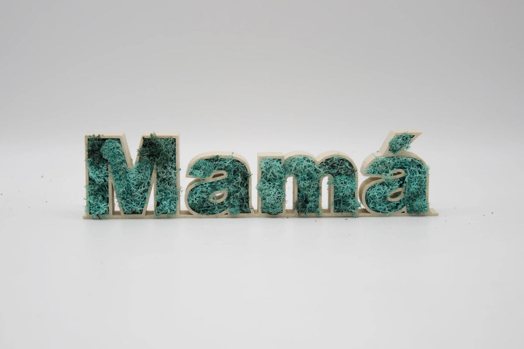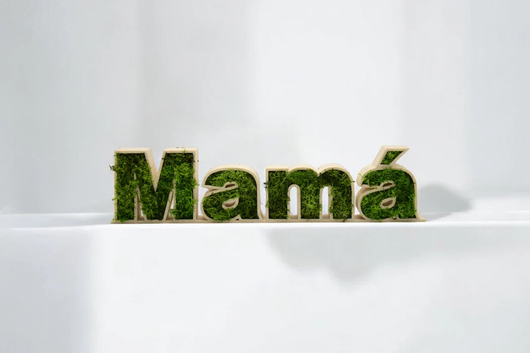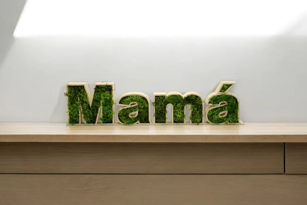 Letras impresas en 3D con la palabra "Mamá", rellenas de musgo preservado de alta calidad en diversos colores. Perfectas para decoración interior y como regalo especial.